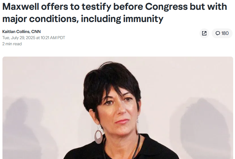 Ghislaine Maxwell, đồng phạm của Jeffrey Epstein, đã đề nghị sẽ ra làm chứng trước Quốc hội, nhưng với những điều kiện nghiêm ngặt, bao gồm quyền miễn trừ, theo danh sách các yêu cầu mà luật sư của bà gửi đến Ủy ban Giám sát Hạ viện.