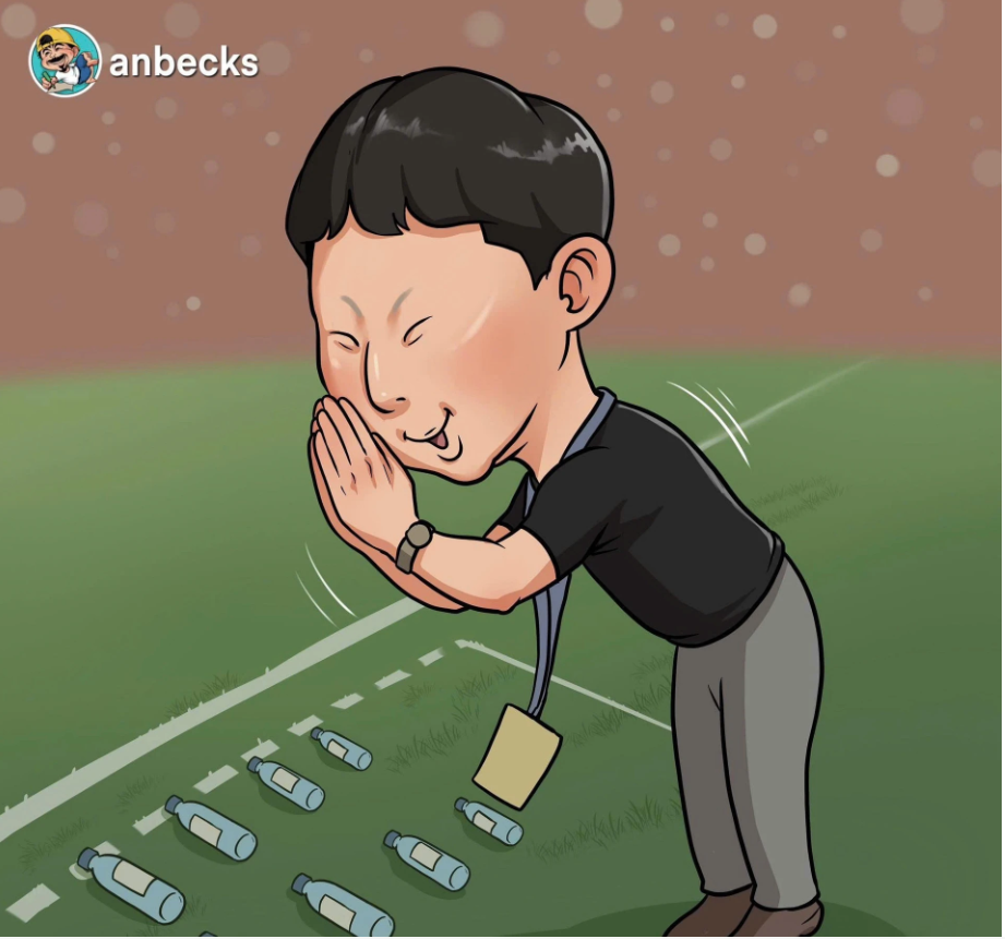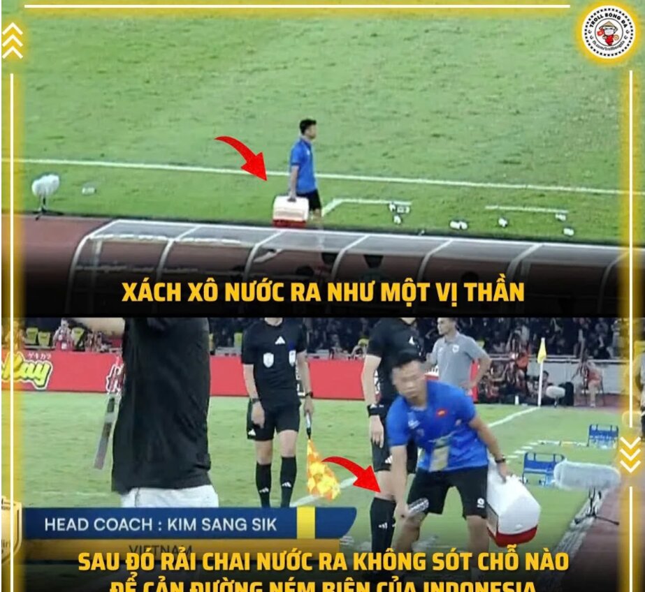 Bị những chai nước cản trở, kế hoạch tấn công của đội chủ nhà hoàn toàn thất bại. Cầu thủ ném biên buộc phải ném bóng ngược về cho thủ môn, chấm dứt hy vọng gỡ hòa. Thậm chí một thành viên ban huấn luyện U23 Indonesia bực tức chạy ra đá chai nước và bị trọng tài phạt thẻ đỏ. Hình ảnh trợ lý của HLV Kim miệt mài "xách nước bổ cam" dọc đường biên khiến dân mạng cảm thấy hài hước. "Tưởng xách nước bổ cam mà đơn giản à", một người vui vẻ bình luận. Ảnh: Troll Bóng Đá/Facebook.