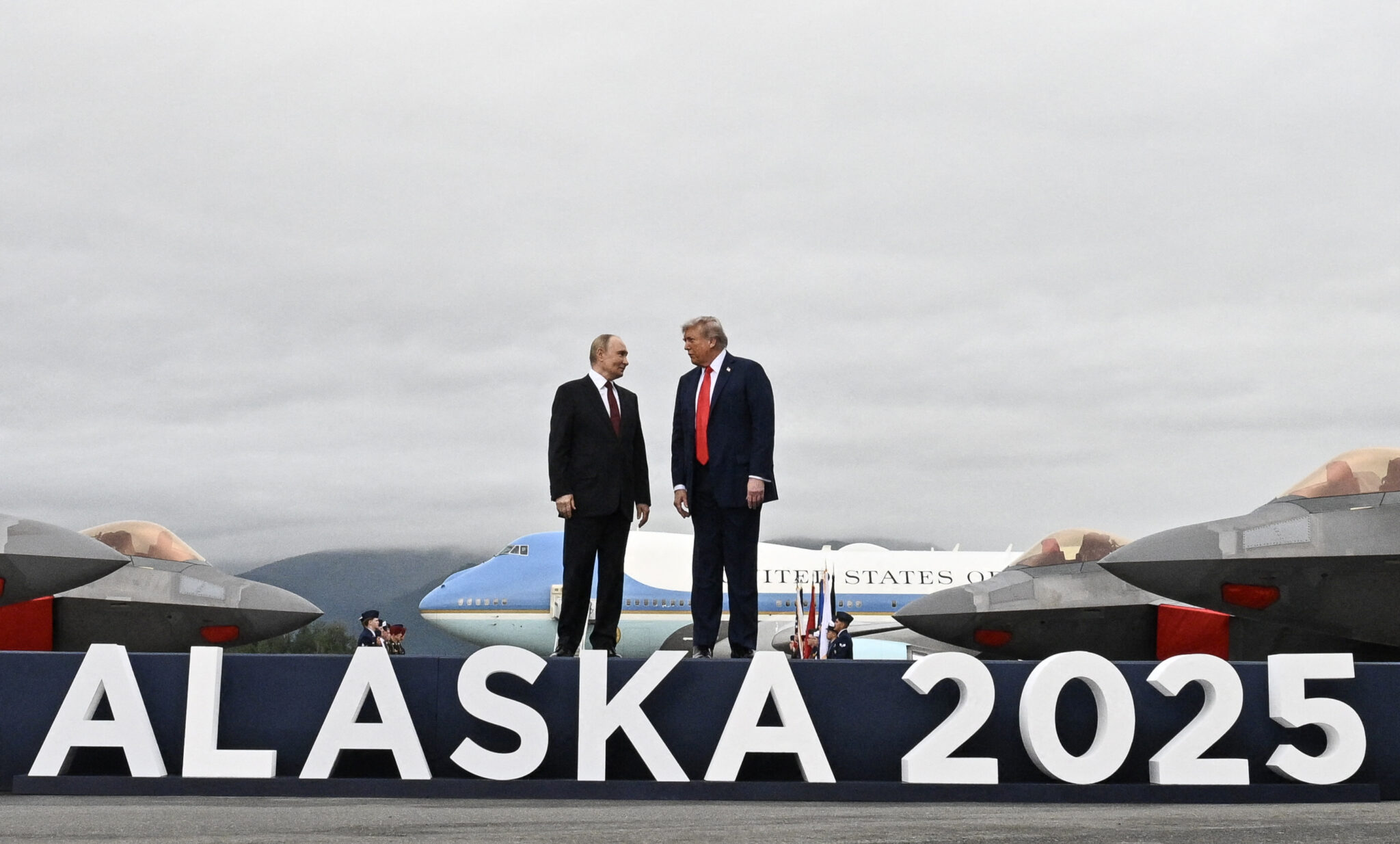 Ông Donald Trump (phải), tổng thống Mỹ, ra về với "tay không" sau khi gặp ông Vladimir Putin, tổng thống Nga, tại Joint Base Elmendorf-Richardson ở Anchorage, Alaska, hôm thứ Sáu, 15 tháng Tám. (Ảnh: Andrew Caballero-Reynolds/AFP via Getty Images)