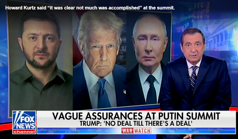 Người dẫn chương trình Media Buzz cho biết hôm Chủ nhật rằng "mặc dù có một số cuộc thảo luận lạc quan" sau hội nghị thượng đỉnh hôm thứ Sáu về việc chấm dứt chiến tranh của Nga tại Ukraine, "Rõ ràng là không có nhiều thành tựu nào đạt được."