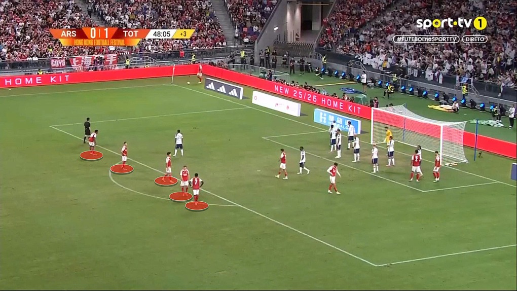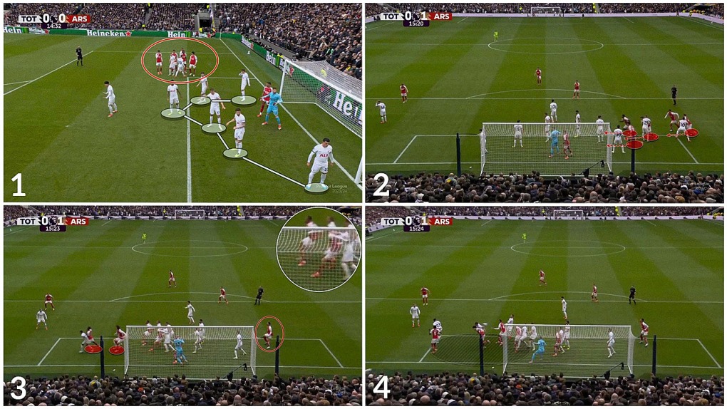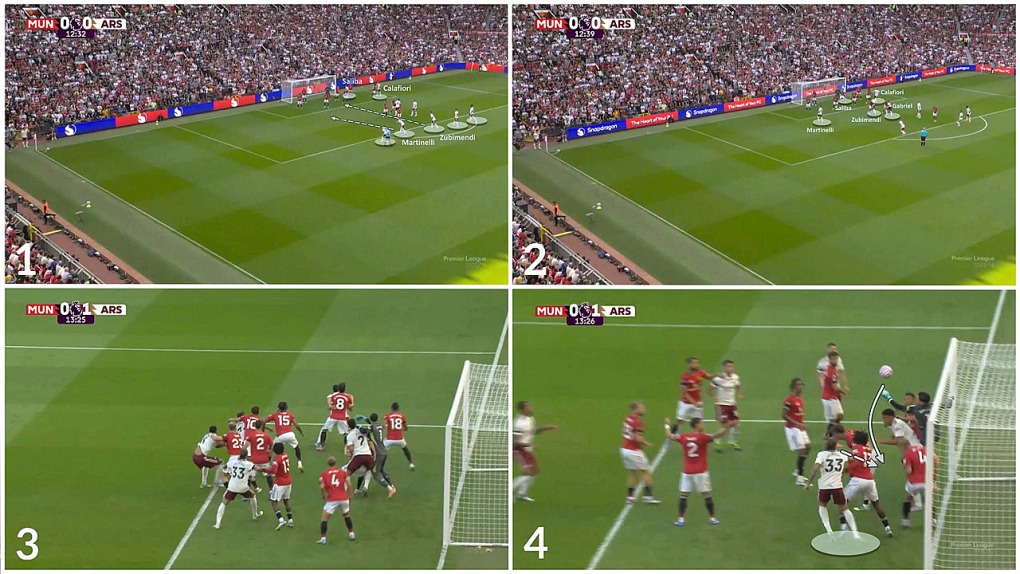 Hai cầu thủ chạy chỗ từ nhóm năm người ở rìa vùng cấm là Gabriel Martinelli và Martin Zubimendi đã tạo ra sự hỗn loạn ở khu vực trung tâm khi bóng được tạt vào. Dù tập trung toàn bộ cầu thủ bên trong vùng cấm, với năm người cố định bên trong vùng 5m50 để phòng ngự khu vực, bốn người phòng ngự một - kèm - một và một người phòng ngự tự do ở chấm penalty, Man Utd cũng không thể chống lại pha dàn xếp mới này của Arsenal.