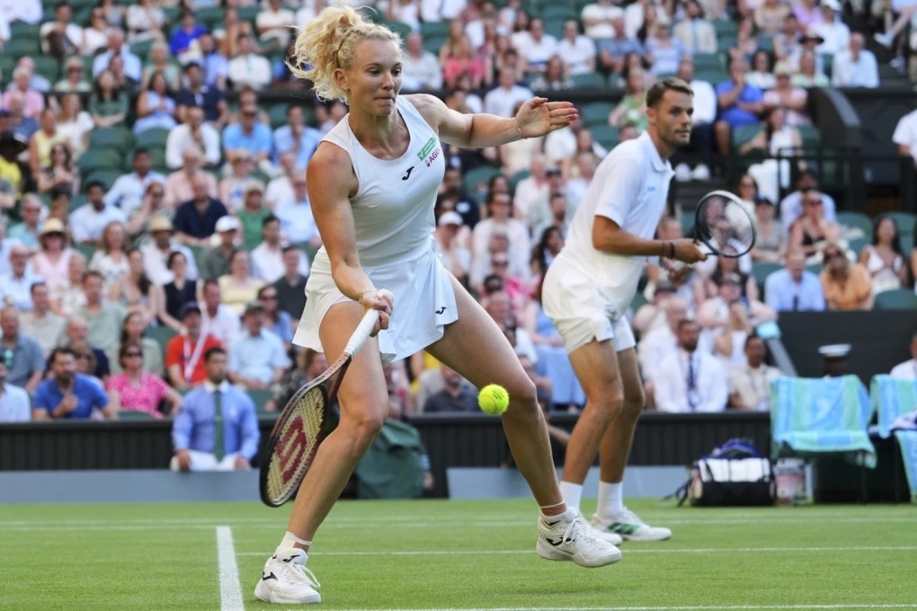 Katerina Siniakova - Sem Verbeek trong trận chung kết đôi nam nữ Wimbledon 2025. Ảnh: AP