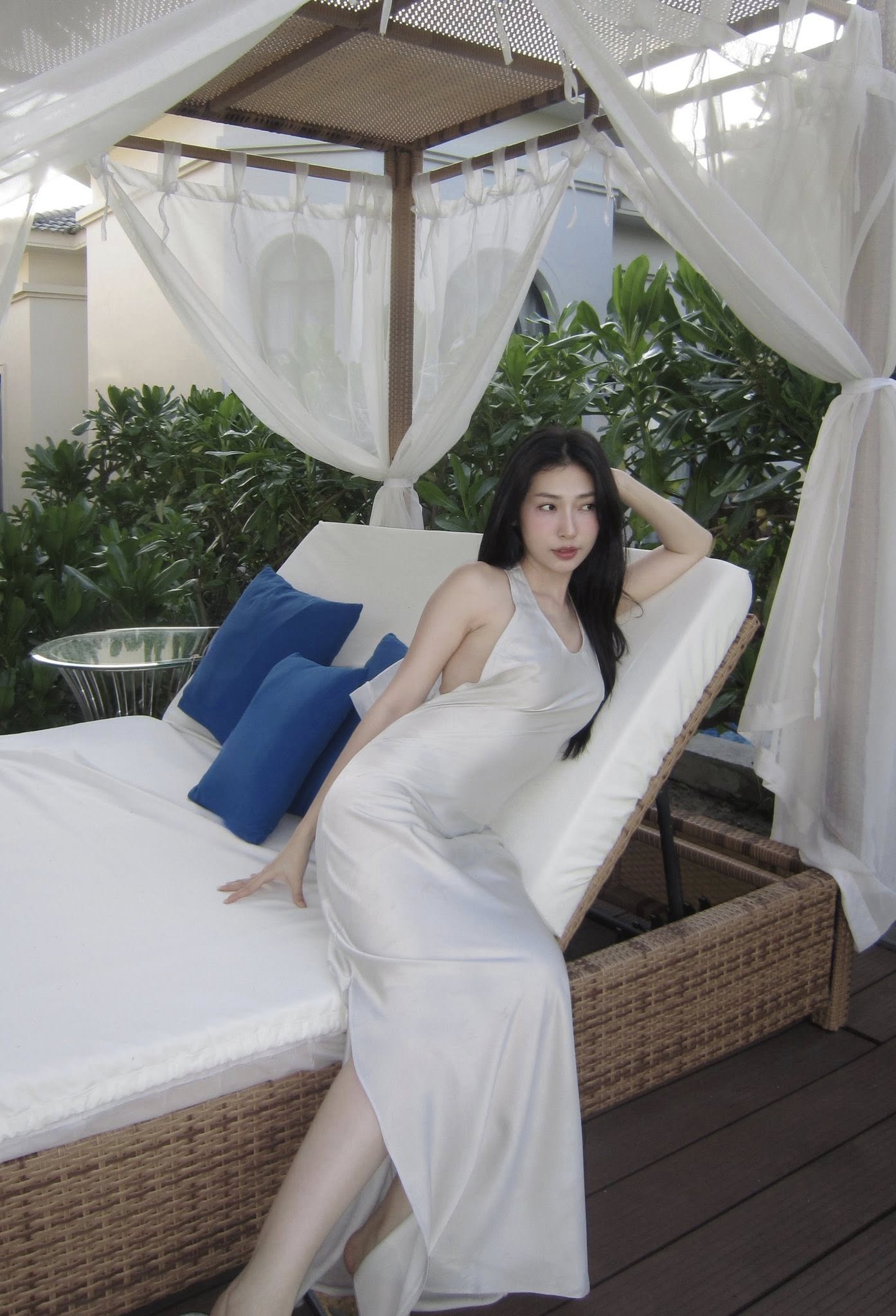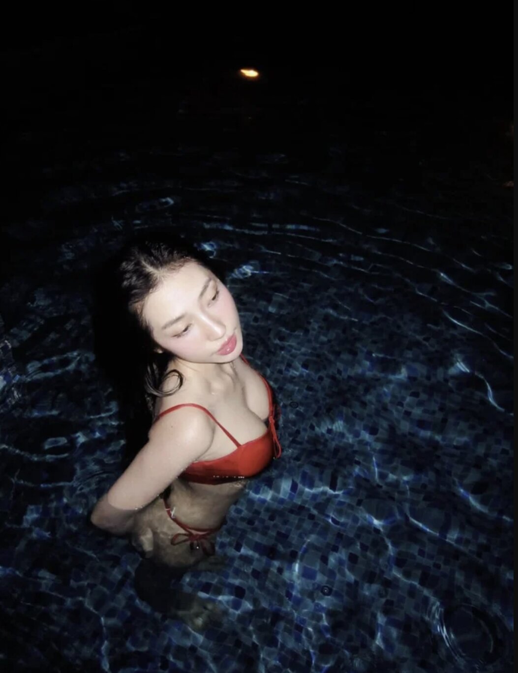Trong không gian hồ bơi lung linh về đêm, nữ ca sĩ tự tin tạo dáng, khoe trọn đường cong quyến rũ cùng làn da trắng mịn. Với bộ bikini nhỏ xíu, người đẹp đã mang đến hình ảnh đầy sức sống.