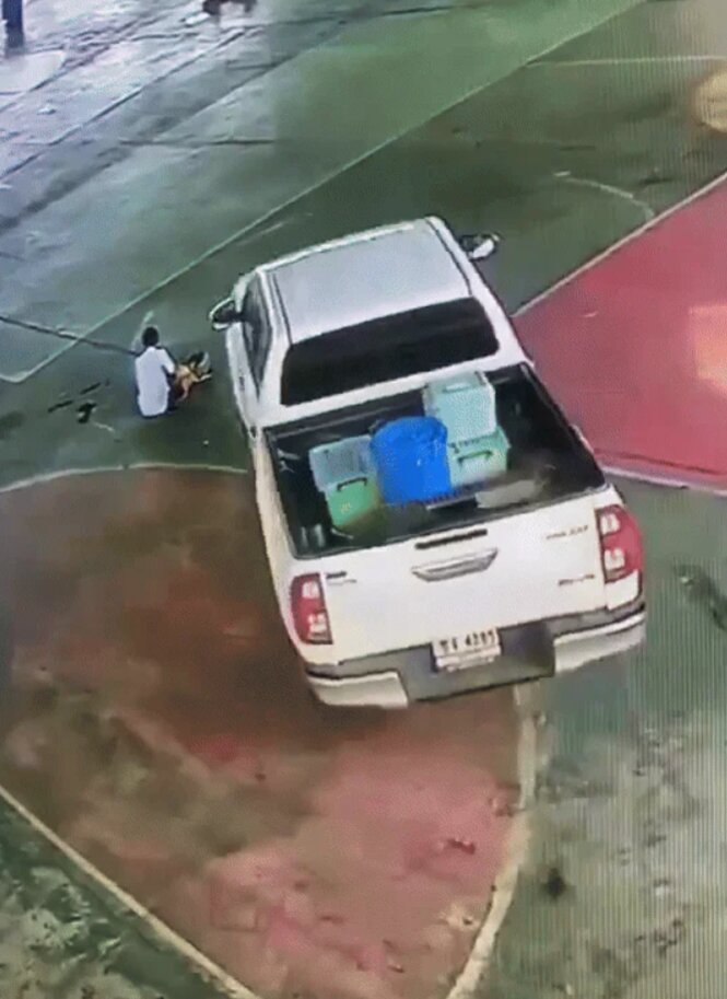 Hình ảnh do camera an ninh tại trường học ghi lại cho thấy tài xế đã lên xe lái đi mà không có sự quan sát cẩn thận. Vì thế, anh ta đã lái chiếc xe về phía bên trái, bất ngờ cán qua cậu bé. Nạn nhân đã mau chóng được đưa đến bệnh viện cấp cứu, nơi các bác sĩ xác nhận em bị gãy xương chậu. Hiện em vẫn đang trong tình trạng nguy kịch tại Bệnh viện Udon Thani.