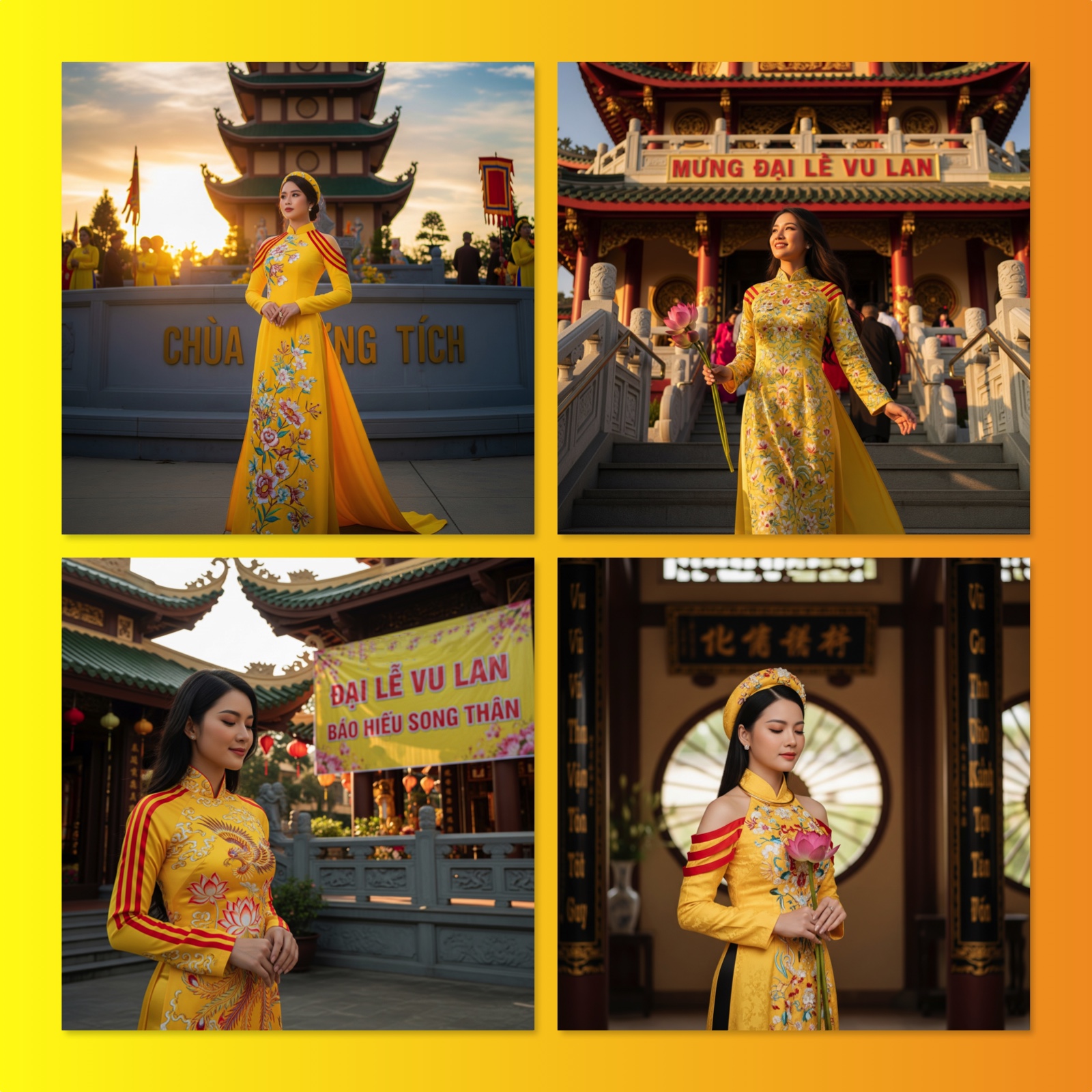 Một thiếu nữ trong áo dài vàng thêu rồng phượng, tay cầm hoa sen, đứng trang nghiêm trước cổng chùa.