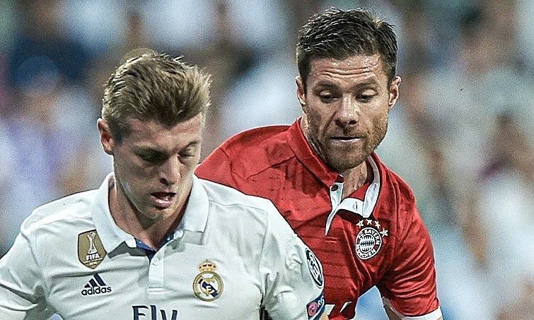 Kroos (trái) và Alonso tại lượt về tứ kết Champions League 2017 giữa Real và Bayern trên sân Bernabeu, thành phố Madrid, Tây Ban Nha tối 18/4/2017. Ảnh: X/Football__Tweet