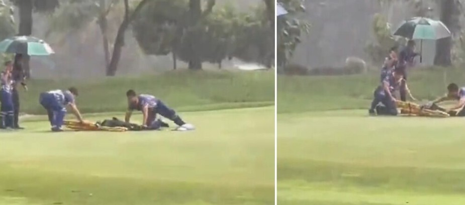 Trong video, trời mưa nặng hạt, nữ caddie nằm bất tỉnh trên mặt cỏ ngoài trời. Lực lượng cứu hộ cùng đồng nghiệp che ô, cẩn trọng tiếp cận vì lo ngại nguy cơ sét tiếp tục giáng xuống.