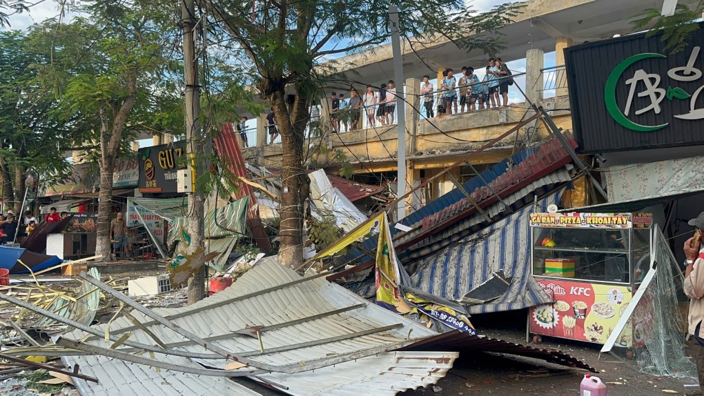 Tại hiện trường, ba ki-ốt ốp sát vào tường bao sân vận động, mỗi gian khoảng 15 m2, đổ sập. Mái tôn, sắt thép văng ra đường tỉnh 354, gây ùn tắc giao thông.