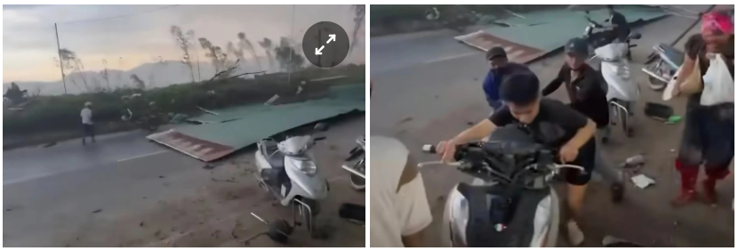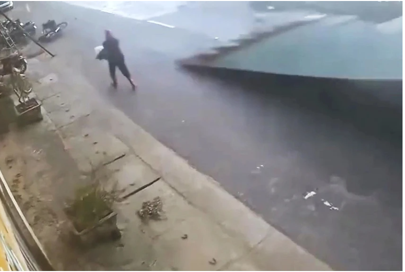 Người phụ nữ nhanh chân chạy thoát trước khi mái tôn lao xuống đường ở xã Vạn An chiều tối 5/10.