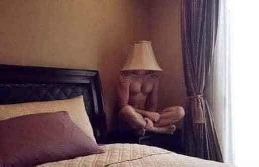 Một phụ nữ đang nằm trên giường cùng người tình thì nghe thấy tiếng đập cửa của ông chồng. Cô vội vã lôi anh chàng vào góc nhà, xịt keo bóng màu gỗ, úp cái chụp đèn ngủ lên đầu... Rồi cô nàng thì thầm:
