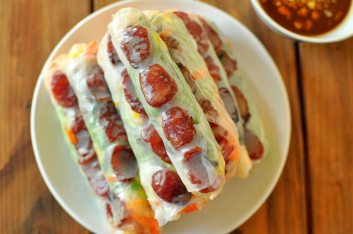 Bước 5: Làm ẩm chiếc bánh tráng rồi lần lượt xếp rau diếp, củ đậu, cà rốt, trứng, tôm khô lên bánh, cuộn lại. Khi cuộn được nửa vòng thì xếp lạp xưởng vào (giống cách cuốn của gỏi cuốn tôm thịt) và cuộn lại cho đến khi hết. Làm tương tự với các nguyên liệu còn lại.