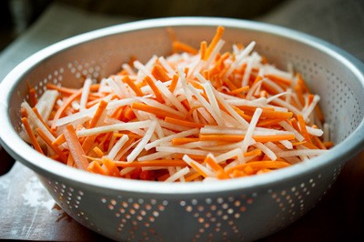 Rửa sạch cà rốt và củ cải sau đó thái sợi vừa ăn.