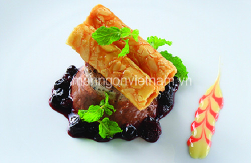 Bước 6: Cho dâu rừng nấu đường ra đĩa, lấy kem từ tủ đông ra, xếp bánh hạnh nhân lên trên.