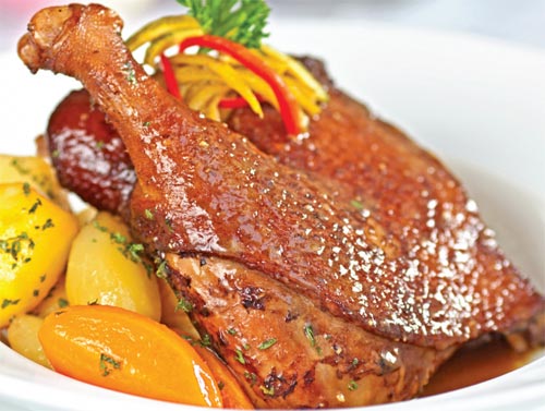 - Nước xốt cam: Làm tan chảy bơ, phi vàng tỏi băm, cho nước cốt cam vào đun nhỏ lửa, nêm muối tiêu vừa ăn. Cho đùi vịt, các loại rau củ ra đĩa sâu lòng, rưới nước xốt cam, ngò rí băm nhuyễn.
