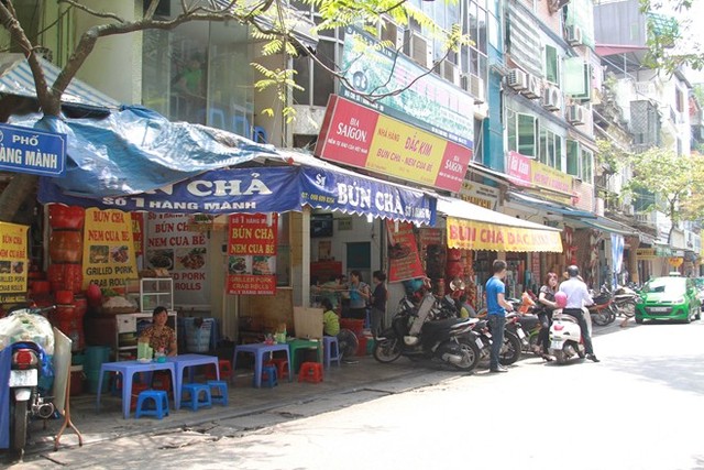 Tại Nguyễn Khuyến - con phố nổi tiếng với đặc sản bún chả mang thương hiệu Sinh Từ - có cả dãy cửa hàng treo bảng quảng cáo thương hiệu trên.