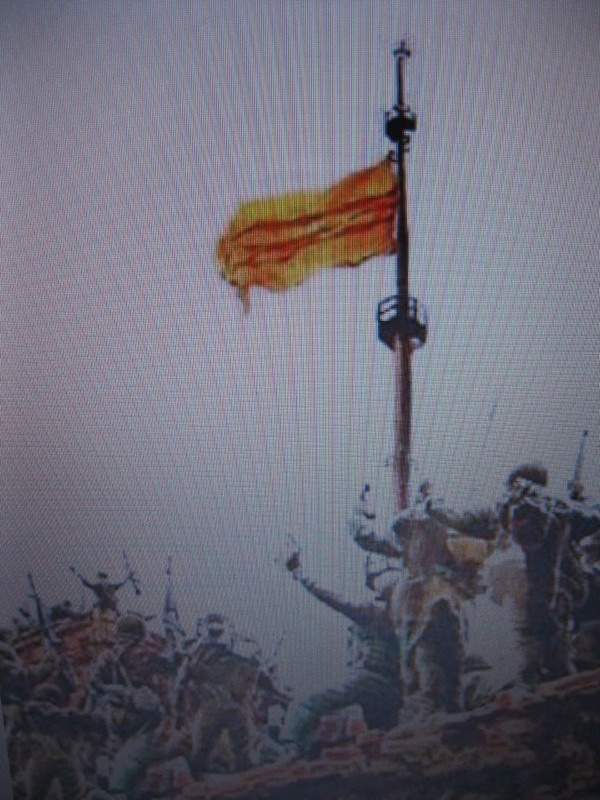 "Trong cuộc tổng công kích Tết Mậu Thân 1968 tại Huế, Việt Cộng đã chiếm được Ðại Nội, họ chuẩn bị sẵn một lá cờ rất lớn treo lên cột cờ tại đây. Chúng ta phản kích và lấy lại được khu đất này. Trong khi vẫn còn những ụ súng phản kháng của Việt Cộng thì một trung sĩ quân lực Việt Nam Cộng Hòa trèo lên cột cờ, xé tan lá cờ Việt Cộng và treo lá cờ của mình lên.