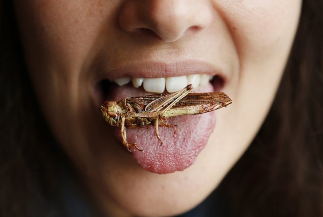 Một con châu châu nằm trong miệng của một người ăn tại một sự kiện nhằm quảng bá lợi ích về dinh dưỡng của côn trùng ở Brussels, Bỉ.