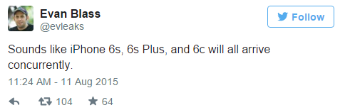 Mới đây, nguồn tin rò rỉ công nghệ uy tín Evan Blass (@evleaks) đã bất ngờ đăng tải trên tài khoản Twitter cá nhân thông tin về việc iPhone 6C sẽ được Apple trình làng song song iPhone 6S và iPhone 6S Plus trong sự kiện sắp tới. Thông tin lần này khá đáng chú ý bởi trước đó @evleaks từng có rất nhiều thông tin rò rỉ chuẩn xác về các thiết bị công nghệ. Dù vậy, lần này anh cũng chỉ dè dặt sử dụng cụm từ "có vẻ như" trong cập nhật của mình.