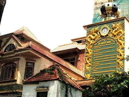 Gần nóc nhà, 1 tấm bảng lớn được trạm trổ đôi rồng màu vàng, nhìn từ xa sẽ khiến nhiều người liên tưởng tới... tấm bia mộ hoặc bia ghi công đức ở đền chùa.