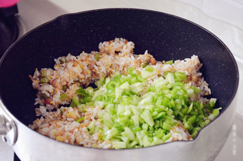 Bước 1: Làm nóng dầu ăn trong chảo. Lần lượt cho hành lá thái nhỏ, tỏi băm nhỏ, cơm, xì dầu, ngô ngọt, đậu Hà Lan vào chiên. Vừa chiên vừa đảo đều. Khi cơm săn lại, cho dưa chuột, ớt xanh, muối, tiêu vào.