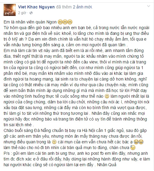 Trên trang cá nhân của mình, Khắc Việt cho biết từ hôm qua đến giờ, anh đã nhận nhiều cuộc gọi và tin nhắn của bạn bè hỏi thăm khi xuất hiện tin đồn trên. Tuy nhiên, nam ca sĩ phủ nhận chuyện đang ở Mỹ để điều trị ung thư và còn hài hước cho biết đêm qua còn nhậu rất tưng bừng cùng bạn bè.