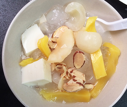 -Cho thạch khúc bạch vào chén + chan nước đường và trái cây đã nấu vào + cho đá bào nhuyễn vào + almond slices + coco nut chips.