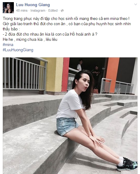 Chia sẻ câu chuyện ngắn trên trang cá nhân, nữ huấn luyện viên quyền lực của Giọng hát Việt nhí đang cảm thấy vô cùng thích thú vì gián tiếp được khen ngợi sở hữu nhan sắc trẻ trung. Diện trang phục khỏe khoắn cùng con gái Mina tới chỗ tập cho học sinh, nữ ca sĩ bất ngờ “được” người khác nhầm lẫn thành con gái của… chồng mình – nhạc sĩ Hồ Hoài Anh.