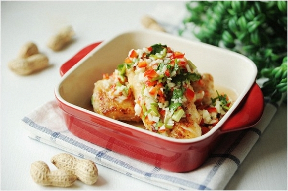 - Nguyên liệu ướp cá: 2 muỗng canh nước mắm (lượng này có thể điều chỉnh tùy thuộc vào loại mắm mà bạn dùng vì mỗi loại có độ đạm khác nhau, độ mặn cũng không giống nhau); 1/3 lòng trắng trứng; 25g ớt bằm; 30g lạc rang giã dập.