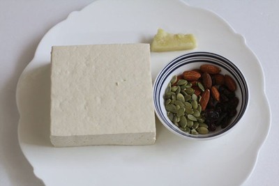 Đậu phụ cắt miếng nhỏ 3cm x 4cm x 0,8cm. Cho 2 muỗng canh các loại hạt băm nhỏ vào chén cùng với tỏi băm, ½ muỗng canh nước tương, 1 muỗng canh đường, ½ chén nước, một chút tiêu khuấy đều.