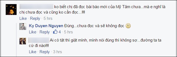 Trưa nay, trong đoạn bình luận mà người hâm mộ để lại trên trang cá nhân, một người viết hỏi thẳng: "Không biết chị đã đọc bài báo mới của Mỹ Tâm chưa, mà e nghĩ là chị chưa đọc và cũng không cần đọc". Đáp trả câu hỏi này, Kỳ Duyên trả lời ngắn gọn rằng: "Đúng. Chưa đọc và sẽ không đọc".