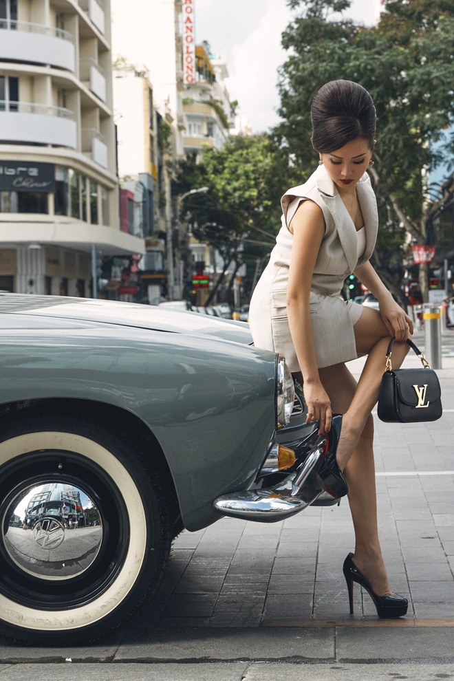 Thu Hoài kết hợp sơ mi kẻ ca-rô và quần ống loe cạp cao. Cô cũng thuê một chiếc ô tô đời cũ để phù hợp với không khí bộ ảnh.