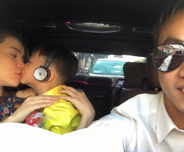 Trong bức ảnh đi kèm, Hà Hồ đang hôn Subeo rất t́nh cảm, trong khi đó Cường Đô La dùng điện thoại chụp lại khoảnh khắc đáng yêu của họ. .