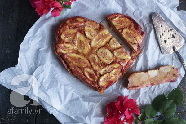 Lớp cuối cùng nhớ xếp chuối cho đẹp, phết thêm một lớp bơ mỏng. Đem nướng khoảng từ 45 đến 60 phút, đến khi nào nhìn mặt chuối lên màu đỏ óng đẹp.