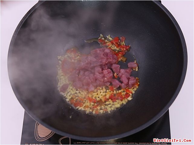 Thịt lợn thái hạt lựu. Nêm muối và rượu vào thịt, đảo đều rồi ướp trong 10 phút.