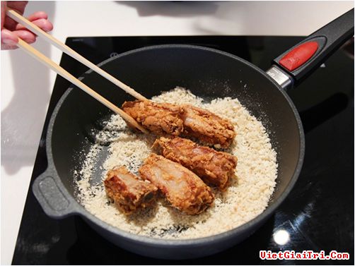 Bước 4: Đun nóng một chút dầu ở chảo khác, xào tỏi và gừng vào trong 30 giây rồi đổ bột chiên xù vò, đảo khoảng 5 phút cho bột vàng rồi đổ sườn vào, đảo cho bột bám đều vào sườn là được.