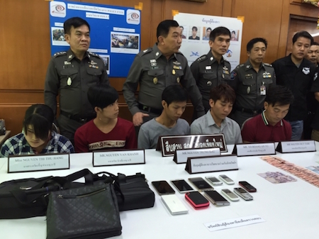 Năm nghi phạm người Việt Nam bị cảnh sát Chiềng Mai bắt giữ cùng tang vật là tiền mặt, điện thoại di động và túi xách...