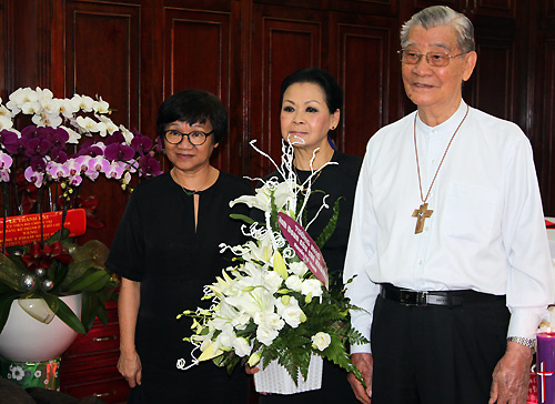 Đức Hồng Y Phạm Minh Mẫn (phải) chủ tế lễ giỗ. Bà Nguyễn Thế Thanh (trái) - nguyên Phó Giám đốc Sở Văn hóa, Thông tin TP HCM có mặt tại buổi này.
