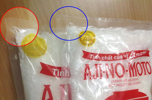 Các mép túi mì chính thật rất đều nhau (vòng tròn màu đỏ), còn các mép gói mì chính giả (vòng tròn màu xanh) thường không đều vì dùng máy ép nhiệt để đóng.