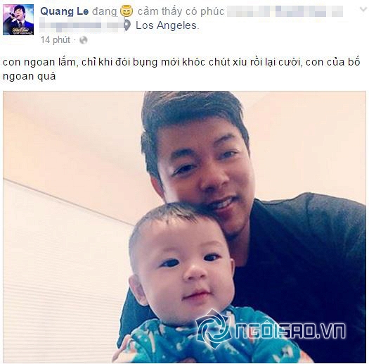 Mới đây, Quang Lê khiến người hâm mộ "đứng ngồi không yên" khi khoe hình ảnh chụp cùng một nhóc tỳ xinh xắn. Trong đó, nam ca sĩ "Đập vỡ cây đàn" viết: "Con ngoan lắm, chỉ khi đói bụng mới khóc chút xíu rồi lại cười. Con của bố ngoan quá". Ở phần bình luận, Quang Lê còn giải thích rõ hơn: "Có con rồi mới biết thương cha mẹ mình nhiều hơn".
