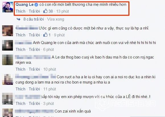 Chia sẻ của Quang Lê đã khiến nhiều người hâm mộ bất ngờ: "Anh Lê thông báo cưới vợ bao giờ đâu mà giờ đã có con rồi", "Đã có vợ đâu mà đã có con rồi nhỉ"...