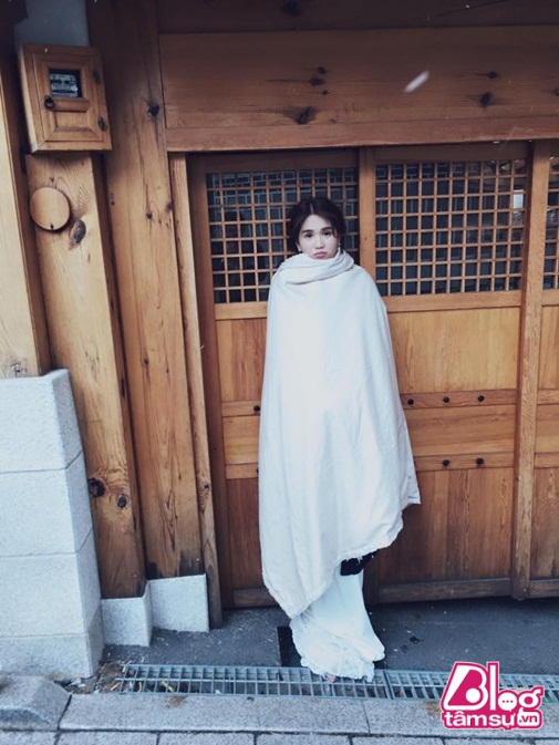 Ngọc Trinh khoe ảnh chụp váy cưới đẹp long lanh dưới tiết trời âm độ C. Tưởng rằng cô chịu rét giỏi, thật không ngờ người đẹp đã phải quấn cả chiếc chăn như thế này.