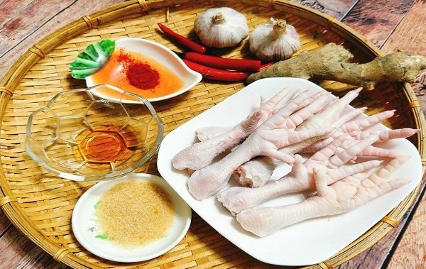 Chân gà mua về đem rửa thật sạch với nước, sau đó ngâm với nước muối loãng khoảng 10 – 15 phút rồi vớt ra, xả lại.