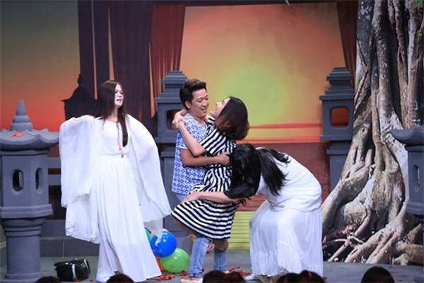 Trước đó, ở tình huống thứ 2 của tập thi thứ ba Ơn giời, cậu đây rồi, Vân Trang và Trường Giang vào vai một đôi tình nhân đang hẹn hò tại công viên. Còn Chí Tài và Vỹ Dạ đóng vai hồn ma , liên tục ra tay chọc phá Vân Trang khiến cô nhiều lúc “hóa điên”. Đến cao trào, Vân Trang đã dùng hết sức bình sinh để ôm cổ, bám, bấu chặt và dùng hai chân quặp lấy Trường Giang. “Mười Khó” cũng có nhiều hành động thân mật, ôm, hôn Vân Trang khiến MC Xuân Bắc phải ghen tị.