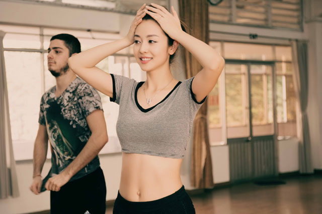 Cô nàng còn cố gắng ép dẻo cơ thể để thực hiện những động tác khó một cách dễ dàng.lịch tập luyện vất vả khiến cô giảm cân 1 cách tuyệt đối thậm chí có cơ bụng