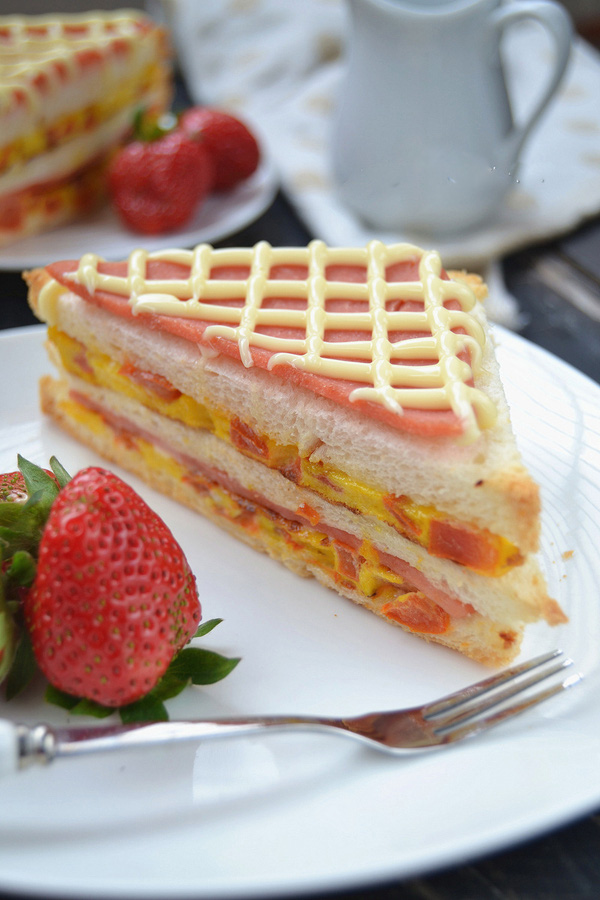 Dùng dao cắt bỏ phần cứng xung quanh lát bánh mì sandwich, cho sốt mayyonnaise lên trên lát bánh mì sandwich thứ nhất. Bạn lần lượt đặt miếng trứng cà chua thứ nhất trên, tiếp theo là lát thịt ham, lát bánh mì sandwich thứ hai, đến miếng trứng cà chua thứ hai, lát bánh mì sandwich thứ ba, lát thịt ham trên cùng.