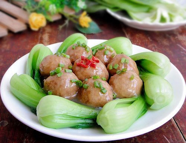 Bạn thấy lớp vỏ bên ngoài ngả vàng thì vớt thịt ra để ráo dầu. Bắc chảo lên bếp, đổ nước dùng, đun sôi cho thịt viên cùng với ½ muỗng cà phê muối, hạt tiêu trắng, nước tương vào chảo, nêm nếm gia vị vừa ăn. Sau đó, cho nước tinh bột vào chảo đun trên lửa vừa thấy nước sền sệt là được. Đun nồi nước sôi, thêm 1 ½ muỗng cà phê muối và một ít dầu vào nồi, tiếp theo cho cải thìa đã rửa sạch vào nồi luộc chín, vớt ra.