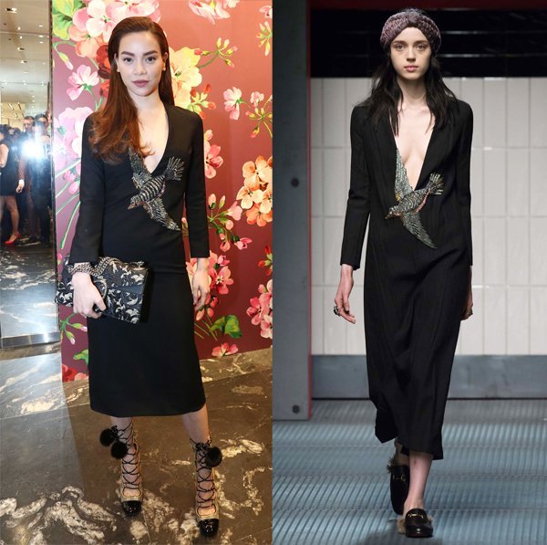 So với trên sàn diễn, phom dáng của bộ đầm Gucci Thu đông 2015 trông đẹp hơn hẳn khi được khoác lên người Hồ Ngọc Hà. Bà mẹ 1 con kết hợp phụ kiện cùng hãng để tới dự event hôm 19/11/2015.