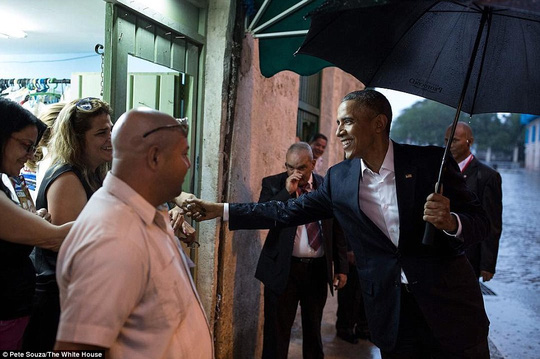 Một bức ảnh khác cũng được chụp trong ngày 20-3 cho thấy tổng thống Mỹ cầm dù, nở nụ tươi cười chào hỏi những người dân Cuba ở phố cổ Havana.