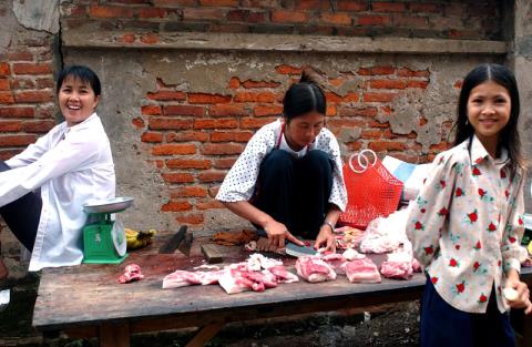 Một chủ sạp bán thịt lợn tại Thanh Oai, Hà Nội ngồi xổm trên bàn để tiện việc chế biến.