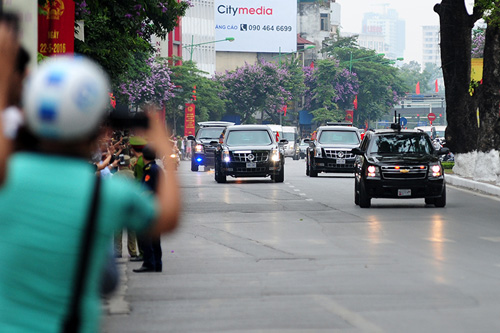 Chiếc quái thú trở tổng thống nổi bật giữa đoàn xe. Hai bên đường người dân hân hoan chào đón. Có lẽ đây là điều vô cùng thiêng liêng của người dân Việt.